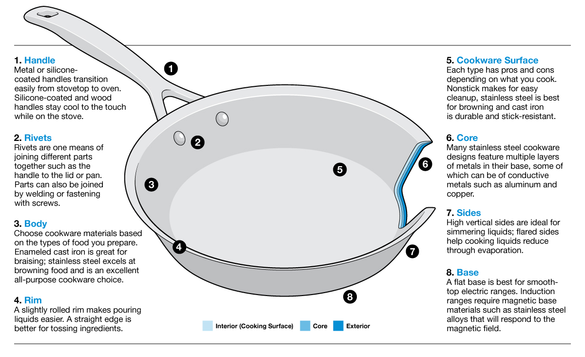 • Body materials are essential to know, and you should choose based on the food you prepare. Stainless steel is a great all-rounder and excels at browning food. For braising, you’re best off with enameled cast iron.