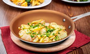 Nonstick coatings are durable, and will release even delicate foods with zero effort. They require little to no oil, and they’re great for nonfat or low-fat dishes. You’ll find they are exceptionally easy to clean and are often ideal for use on just about any kind of cooktop. If you take into account the handle material, most are oven-safe at up to 500 degrees Fahrenheit. However, not all are safe for metal utensils, and not all are dishwasher-safe. The food won’t brown as well, so keep that in mind.