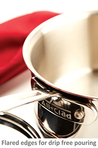 As far as the construction goes, the stainless steel handles of the AllClad Copper Core 7 piece set are all riveted. They’re also contoured and have venting, which results in a comfortable grip. The lids are also stainless steel, and you have flared edges, something we’ll discuss later on. That polished exterior has copper accent highlights, for a lovely design. It is dishwasher safe, too, for easier maintenance.