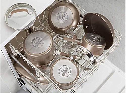 This Select by Calphalon 10 piece set has one goal – easy meal preparation. It is durable and suitable for everyday use. The nonstick interior isn’t easily damaged and made to last. You can clean it with ease. There are comfort grip handles on the hard anodized cookware, that stays cool on the stovetop.