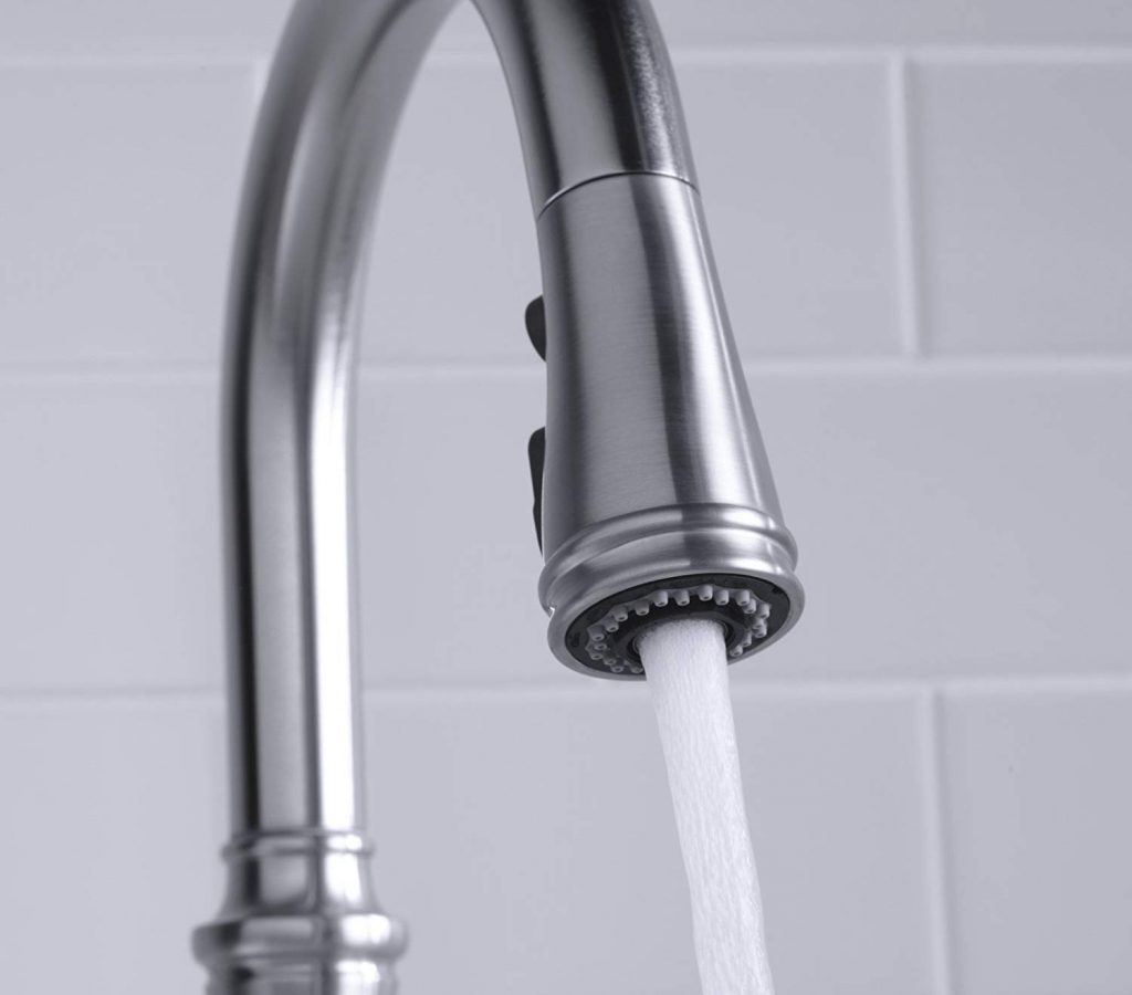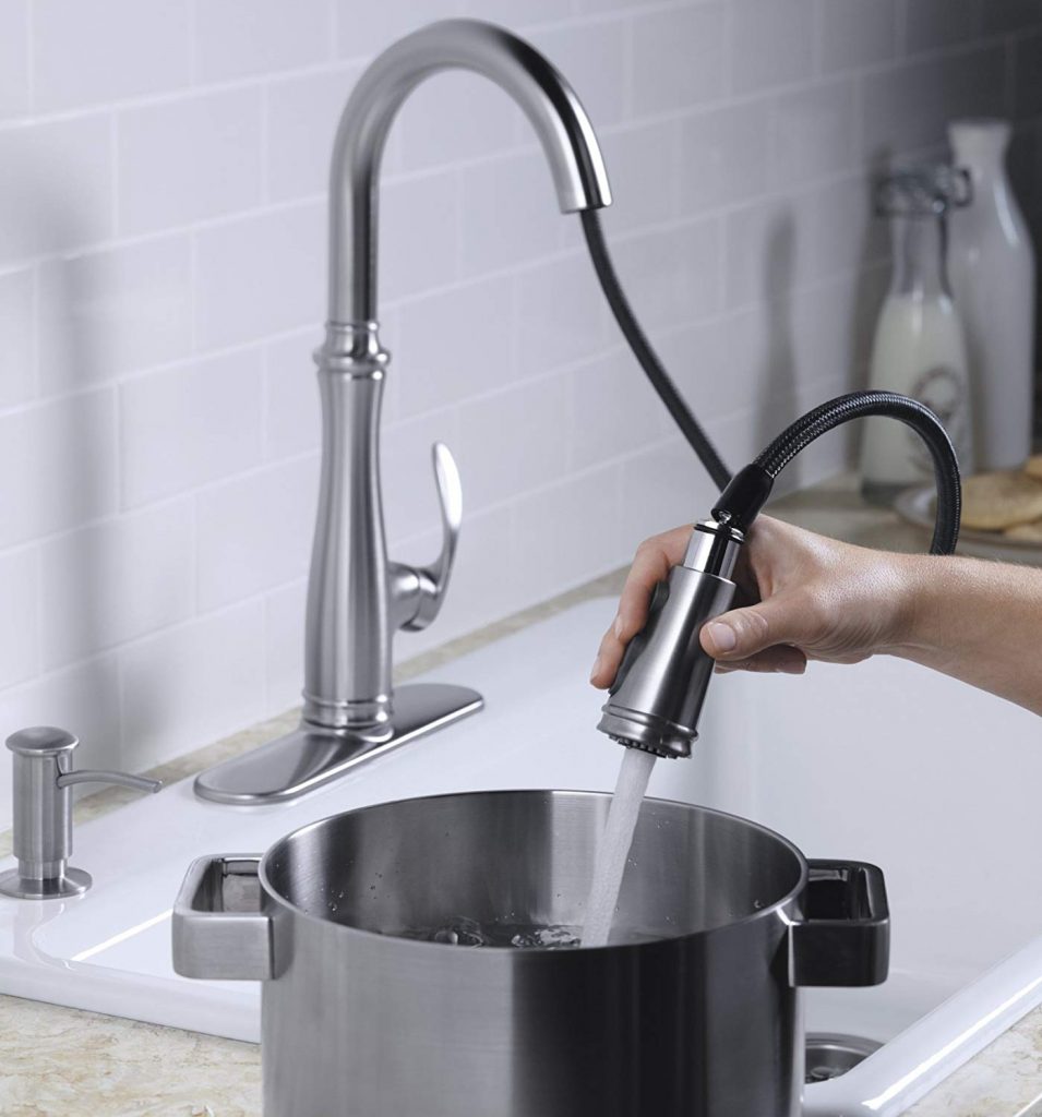 Additionally, it has a DockNetic technology which is a big plus. This technology uses specific magnets which lock the sprayer into place. You won’t have any issues or get wet while doing simple tasks like dish washing. In order to ease your life a bit more, they’ve designed this faucet with easy setup and installation modes. Namely, you can mount it using 1, 2, 3 or 4-hole installation settings – all of which should be clear from the manual. This Kohler faucet also has a flow restrictor which will ensure optimal water pressure is provided, and removing the handle is as simple as with any other faucet. Plenty of 5-star customer reviews can’t be wrong!