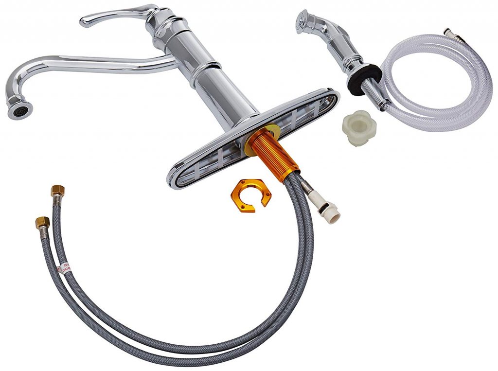Although looking classic, the faucet can rotate not less than 360 degrees. Just like other modern fixtures, this faucet allows precise temperature. So, you can say goodbye to all those times when you’ve burned your hands because of issues like this one. The installation process on the other hand, is also very easy. Generally, it is a 2-hole setup. However, the design is quite convenient and you can use the second hole for the sprayer if you want to. In case you have a 3-hole sink, you don’t need to make adjustments. You can simply use the baseplate.