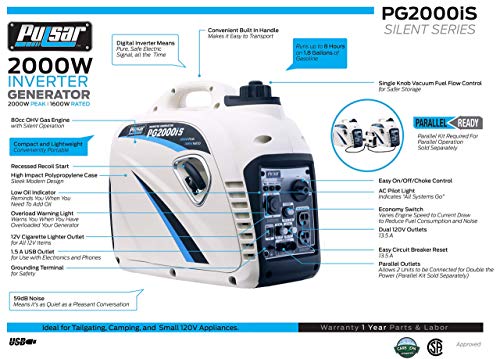 As far as power goes, you will get 1600 running watts, and 2000 starting watts. This is on par with a lot of other products, and that’s where the Pulsar PG2000iS vs Honda debate comes, as Honda has a competitive product with more or less similar power numbers. However, that one is a couple of times more expensive, so we won’t be comparing the two.