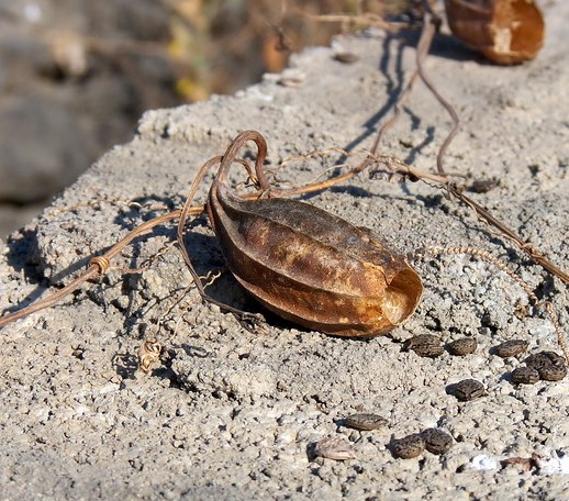 The vines of hard shell gourds produce small white flowers which bloom at night and bear mottled or green fruits in an assortment of sizes and shapes. After harvesting, these can be dried and cured a process that allows them to be stored indefinitely. Cured gourds can be used as musical instruments, in crafts or put into practical uses such as dippers, bowls, birdhouses, bushels or baskets.