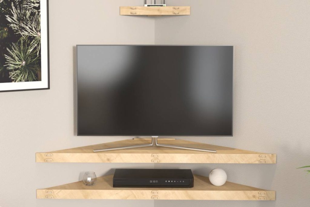 A floating corner TV stand is a space-efficient accessory for entertainment lovers living in a small space. Utilizing the corner space helps maintain a clean and open look in the living area to keep your living area uncluttered while enjoying your favorite shows or movies.