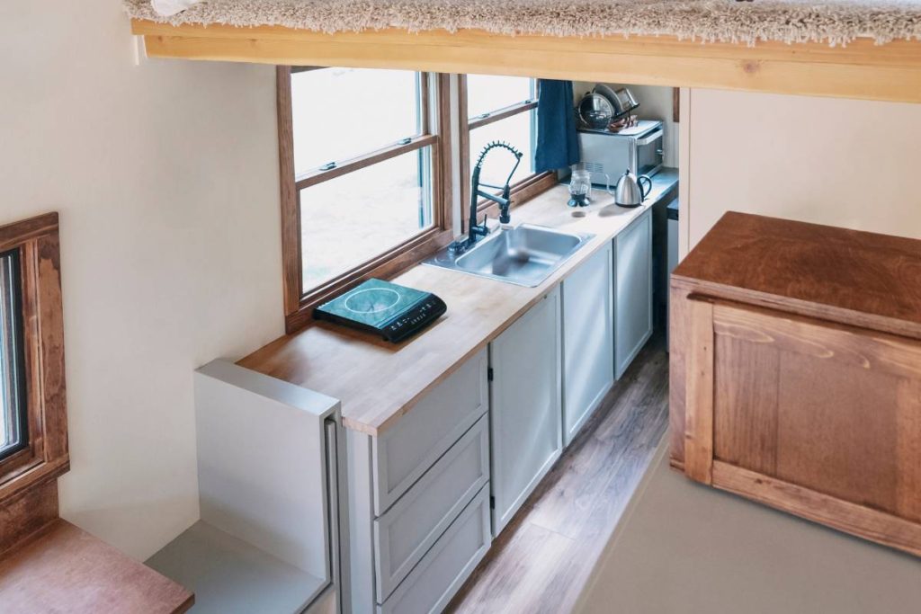 Tiny house kitchens are typically designed as open spaces that seamlessly blend with the living room area. A compact, extendable dining table is perfect if you love hosting dinners but have limited dining space. When not in use, it can be a small, cozy table for two, and when needed, it can be extended to accommodate more people. This table is a great way to enjoy the luxury of a spacious dining table without compromising the space in a tiny kitchen.